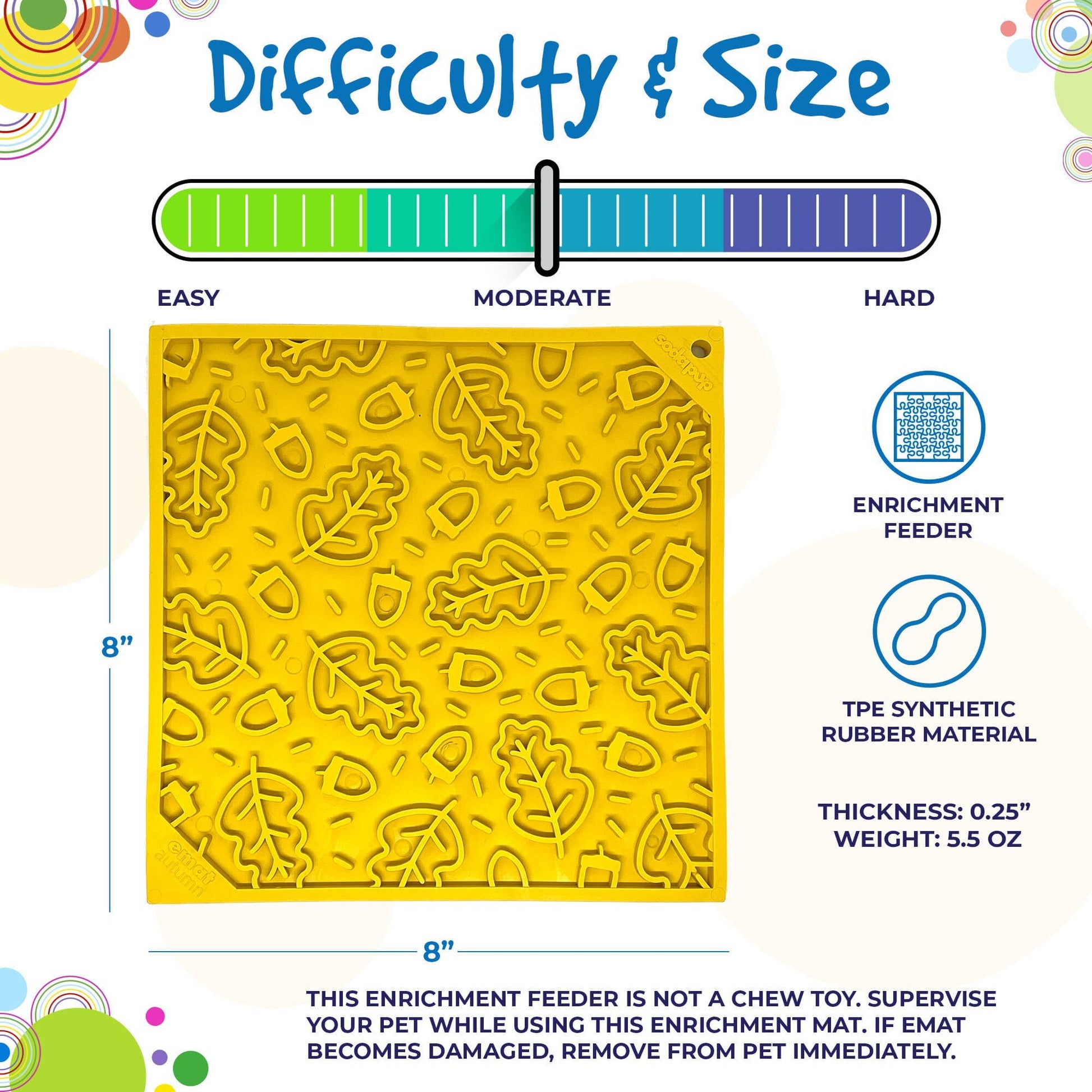 Welcome Fido to fall with the Autumn Design eMat Enrichment Lick Mat! Show your pup the beauty of the season with the orange and yellow of the foliage, while providing a one-of-a-kind licking challenge and soothing effect. Your pup will be barking for joy thanks to the canine enrichment benefits of this lick mat, plus food enrichment benefits that'll have 'em falling for fall!